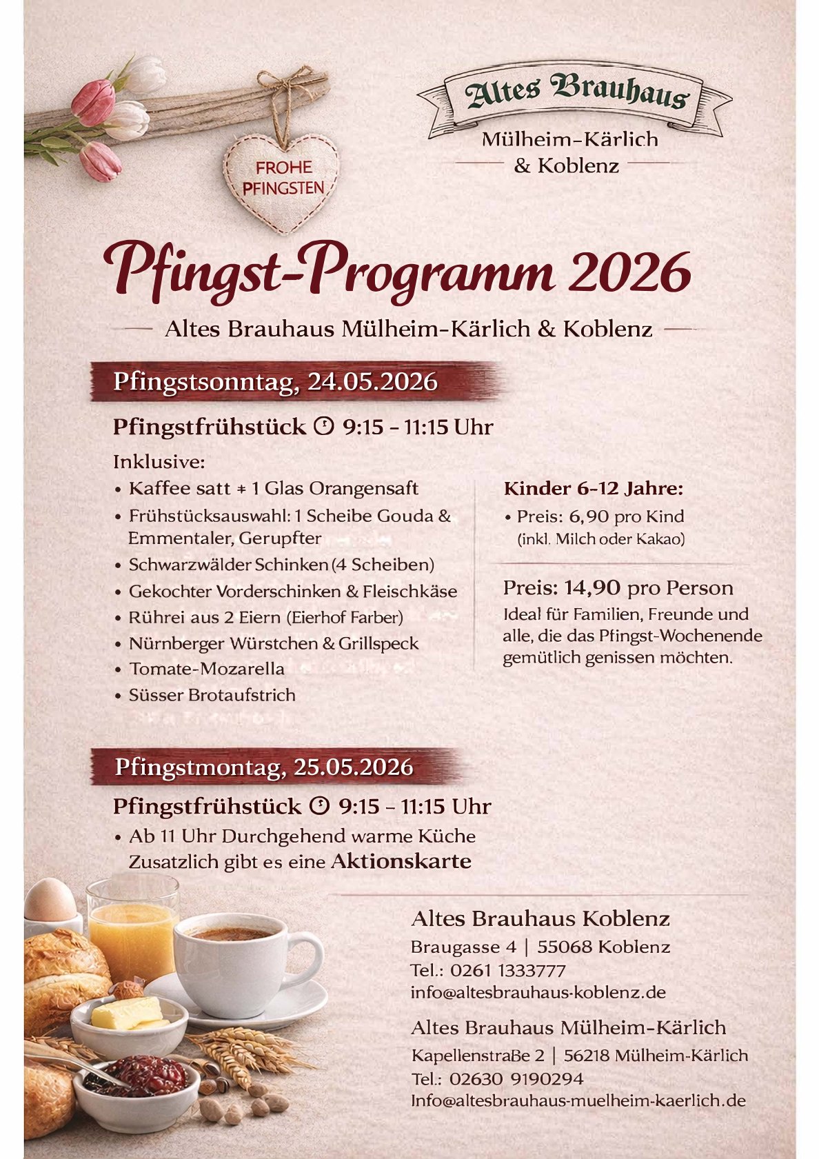 Aktionen Aktionskarten als PDF Speisekarte / Menu deutsch | english Schnitzelbuffet Gegrilltes und Geschmortes Pfingst Programm Willi und Ernst Biergarten-Frühstück Muttertag Pfingsten Handwerker Peters Weihnachts-Comedy Männerschnupfen Hausgemachte Brauhaus-Limonade Kaninchen to Go Aktionskarte Wandern Mülheim-Kärlich 2023 als PDF-Download Ausrichtung eines Beerdigungskaffees als PDF-Download alle Preisangaben ohne Gewähr