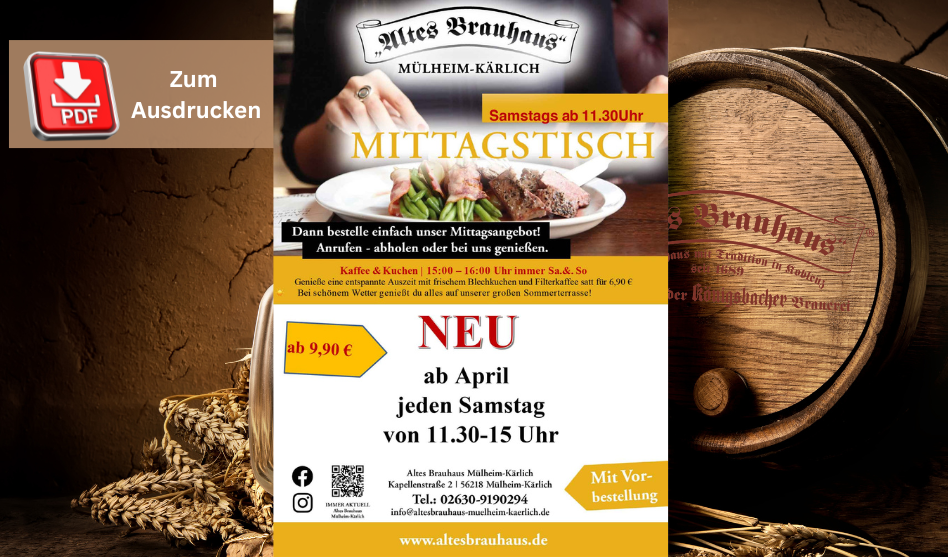Aktionen Aktionskarten als PDF Speisekarte / Menu deutsch | english Debbekoche Öffnungszeiten über Weihnachten und Neujahr Schnitzelbuffet Flugente Hausgemachte Brauhaus-Limonade Kaffee & Kuchen Gänseessen Mittagstisch Aktionskarte Wandern Mülheim-Kärlich 2023 als PDF-Download Ausrichtung eines Beerdigungskaffees als PDF-Download alle Preisangaben ohne Gewähr